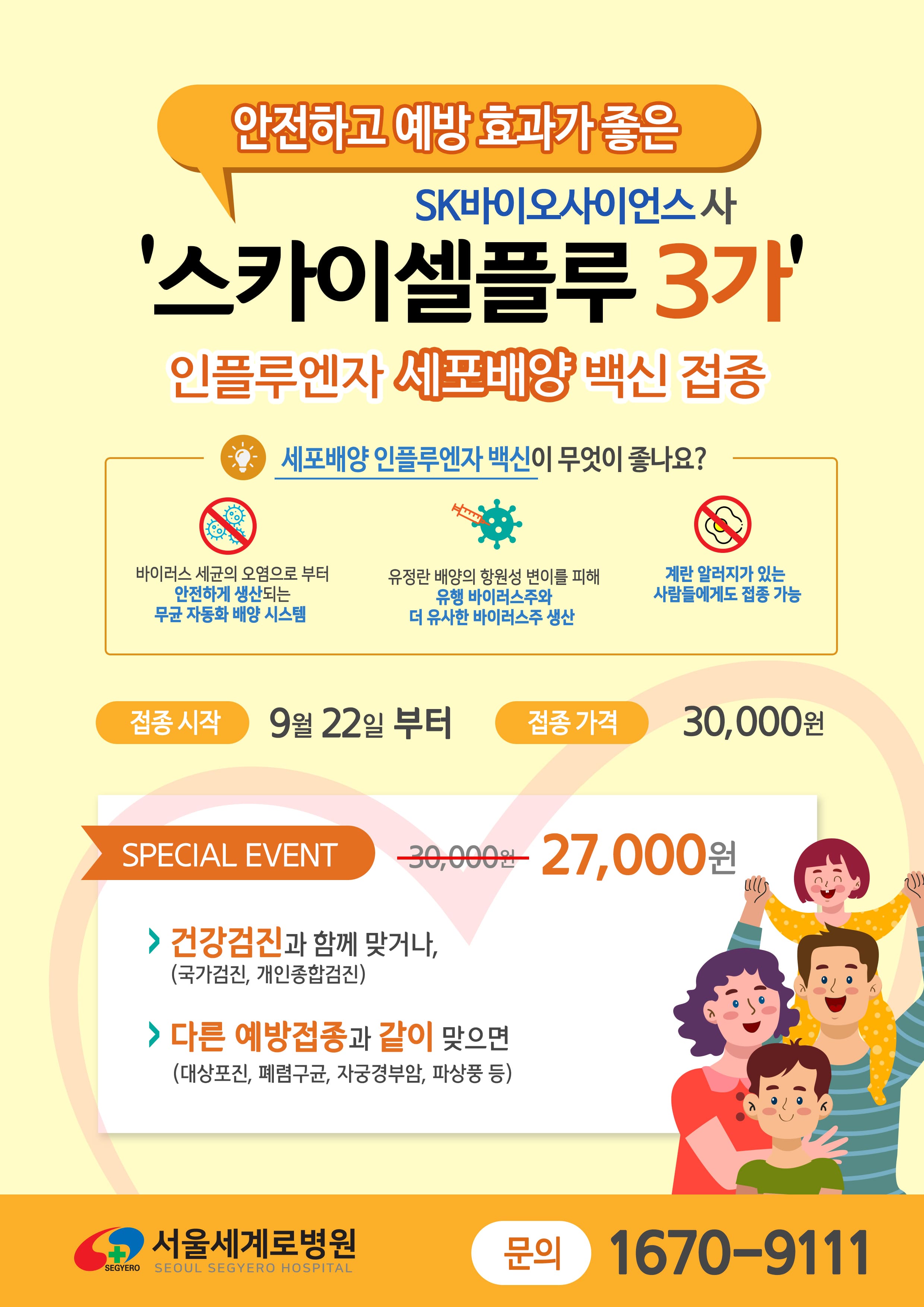 서울세계로병원 독감 예방접종 안내(스카이셀플루 3가)